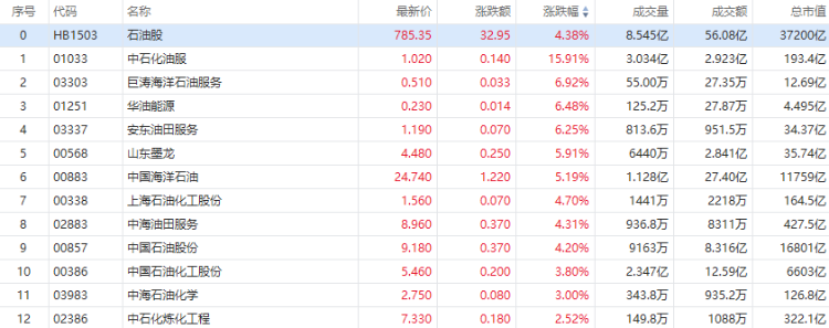 石油股集体走高,中石化油服大涨近16%,中国海洋石油涨超5%,上海石油化工股份、中海油田服务、中国石油股份涨超4%,中国石油化工股份涨近4%。