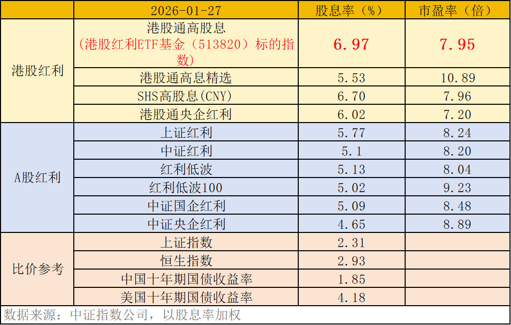 100%纯粹高股息,港股红利“权威经典之选”。港股红利ETF基金(513820)标的指数采用“100%纯粹”高股息选股策略,“大道至简”,纯粹高股息策略往往能“穿越周期”,应对复杂多变的市场风格。截至1月27日,港股红利ETF基金(513820)标的指数股息率达6.97%,领先A股、港股同类指数,为全市场港股红利名副其实的权威“金标准”。