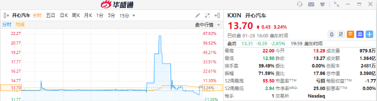 开心汽车一度因涨幅达到熔断限制而暂停交易,当时股价上涨65.79%。
