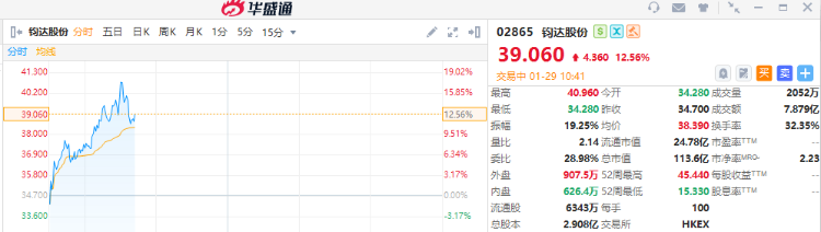 港股钧达股份一度涨超14%,截至发稿,涨12.56%,报39.06港元,成交额7.879亿港元。A股涨超8%,报106元。