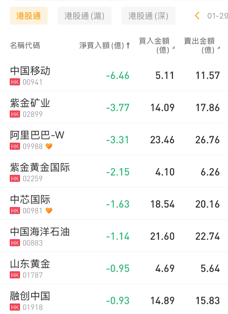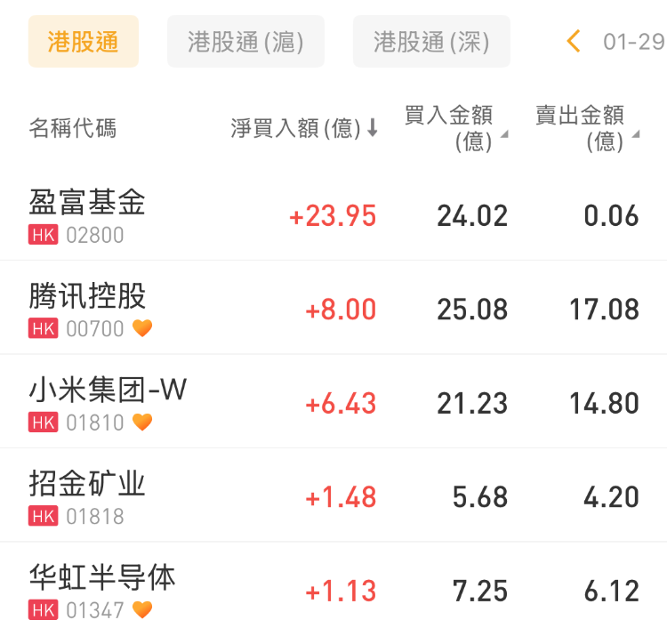 腾讯(00700)获净买入8亿港元。消息面上,1月28日,凭借AI社交新玩法“元宝派”内测、及春节10亿红包活动,腾讯旗下AI助手“元宝”在各大应用商店排名飙升,登上华为应用商城飙升榜第一、苹果中国区APP免费榜第二、VIVO应用商城下载榜第二。