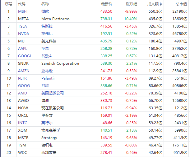 周四美股成交额第1名微软收跌9.99%,成交550.3亿美元。微软在昨日公布财报后大幅下跌,周四的暴跌使微软市值蒸发了近3600亿美元,这是有记录以来的第二大单日市值损失,仅次于英伟达去年一月Deepseek恐慌期间近6000亿美元的暴跌。