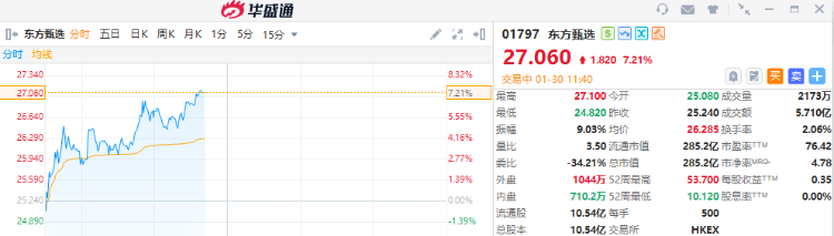 东方甄选再涨超7%,昨日大涨超14%。截至发稿,涨7.21%,报27.06港元,成交额5.71亿港元。