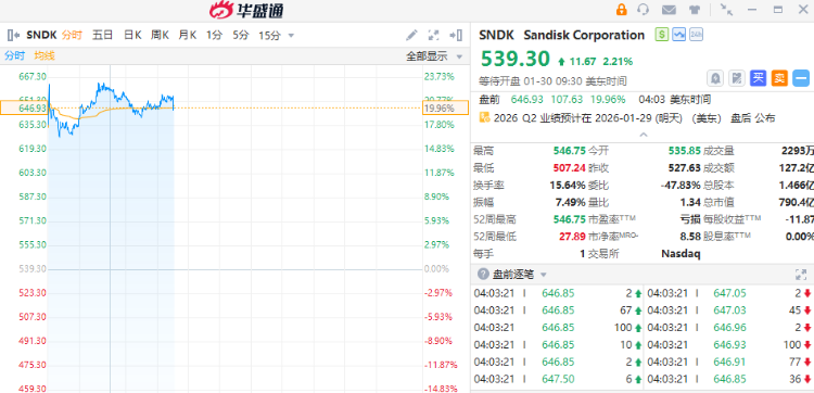 SanDisk $SNDK 盘前暴涨20%,公司存储概念集体大涨,希捷科技涨超3%,美光科技涨超2%。消息面上,AI推动存储需求爆棚,SanDisk季度调整后每股净利润6.2美元,同比增长404%。