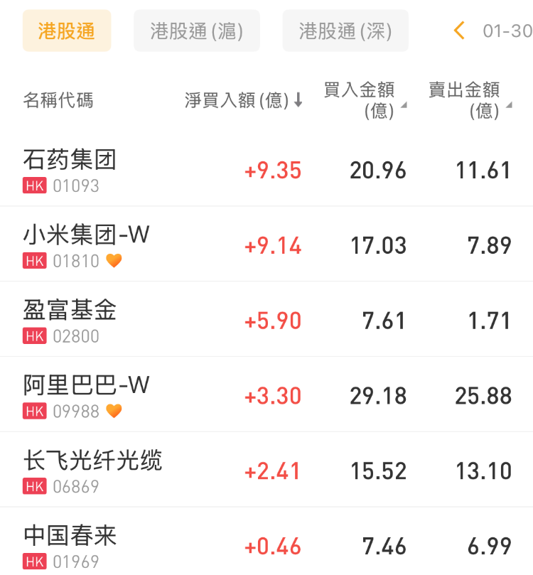 1月30日港股市场,北水成交净买入32.22亿港元,其中港股通(沪)成交净买入20.39亿港元,港股通(深)成交净买入11.83亿港元。