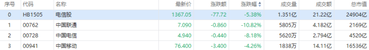 三大运营商早盘低开,截至发稿,中国联通跌近11%,中国电信跌超8%,中国移动跌超4%。