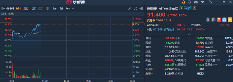 长飞光纤光缆盘中持续走强,截至发稿,涨9.20%,报81.40港元,成交额超18亿港元。
