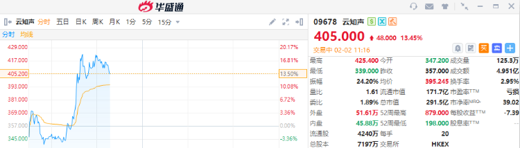 云知声再涨超13%,近四个交易日累涨超85%。截至发稿,涨13.45%,报405港元,成交额4.951亿港元。