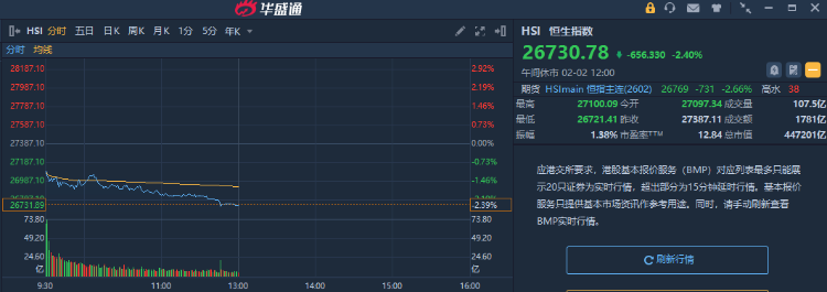 2月2日消息,港股三大指数低开低走。截至午间收盘,恒生指数跌2.4%,报26730.78点,恒生科技指数跌3.68%,国企指数跌2.71%。盘面上,科网股普跌,哔哩哔哩跌超4%,百度、网易、快手、阿里巴巴跌超3%,小米、美团跌超2%;黄金股继续下跌,山东黄金跌超10%;汽车股走弱,小鹏汽车跌9%;芯片股跌幅居前,华虹半导体跌超10%。