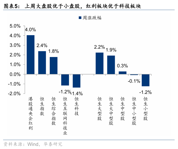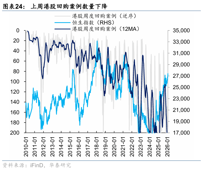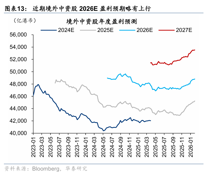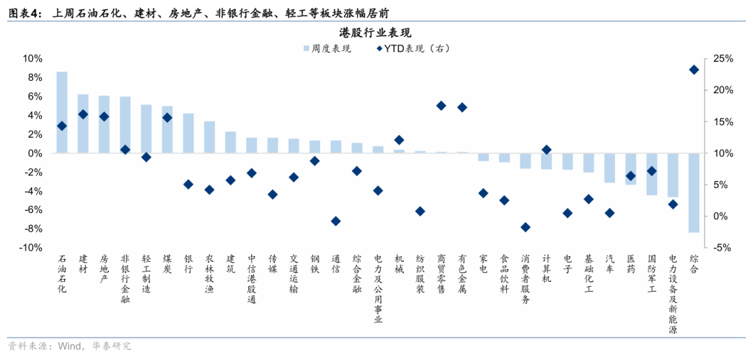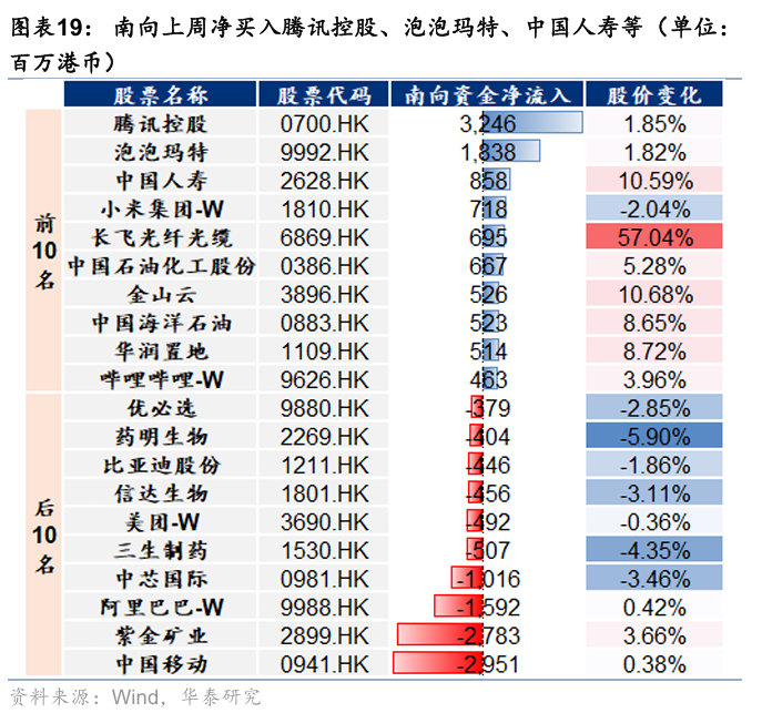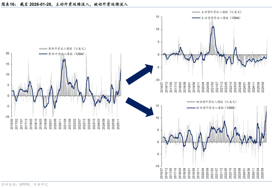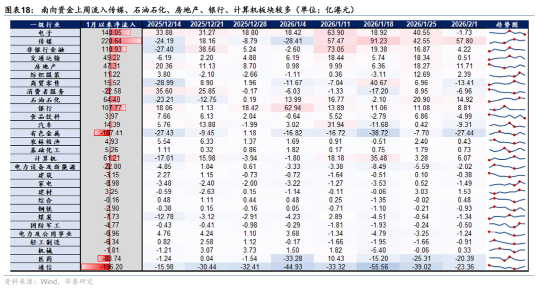 截至周三EPFR口径下外资净流入港股28.0亿美元继续上行(vs 前一周净流入19.5亿美元),其中主动型外资连续三周净流入,单周6.4亿美元续创新高,被动型外资净流入21.6亿美元维持高位,南向净流入港股27.1亿港币,较前一周235亿港币下行,传媒、石油石化、房地产净流入靠前。