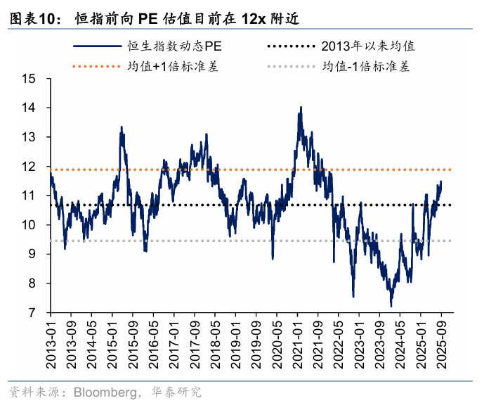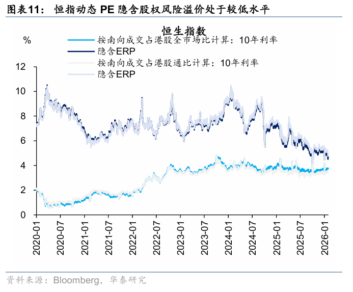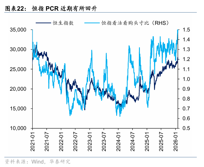 情绪指标升至乐观区间,短线波动风险积累。截至周五港股情绪指数最新读数62.1,较前一周继续回升,已进入乐观区间。归因来看,代表南向资金情绪的净流入、买入强度及AH溢价得分维持高位;衍生品指标方面,恒指升贴水单项已修复至70上方,看沽看购持仓比周四达1.98创2006年以来新高,对应衍生品情绪触及80附近水平(前一周五为35),或对应期权市场参与者Sell Put以期待获取权利金收益或以较低价格构建仓位。