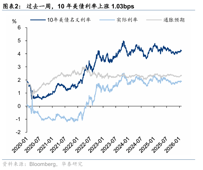 沃什获联储主席提名,短期波动放大但中期流动性偏宽逻辑不变。1月30日沃什被提名为下一任联储主席,消息公布后由于其过往偏鹰派的政策基调,周五晚美债收益率回升,美元走强,各类风险资产有所调整,但其上任后真实操作如何尚未能定论。参考华泰宏观《凯文·沃什接任联储主席的变与不变?》(2026.1.30),中期视角下货币政策总体取向仍然(相对经济的强度)偏宽松、美元内在价值下降的趋势或不会改变。
