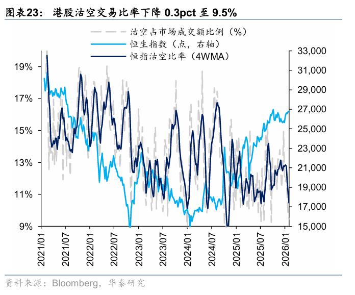 上周,恒指一度创出四年新高。下半周,港股随全球权益资产呈现risk-off特征,前期涨幅较高的科技和周期主线回调较多。我们认为当前市场回调更多是上涨过快的背景下,偏鹰派美联储主席提名导致的技术性回撤。1月下旬反弹以来,情绪指数在短短16天内就从恐慌区间进入乐观区间,我们在《恒生指数四年新高之后》(2026.1.28)中也提示以投资心态而非投机心态看待港股机会。经历了如此调整后,当前的核心问题是波动的持续性和会不会终结市场表现。当前情绪已在乐观区间,且拥挤度尚未明显回落,波动短期或持续,但更多是回撤而不是反转。一季度市场空间的三个驱动因素——流动性改善、资金面共振与盈利预期上修仍然成立。建议更应立足中期视角,重视空间,淡化斜率。板块上以业绩确定性公司作为底仓,近期回调程度较高的科技+周期耗材主线并未变化,可择机增配。