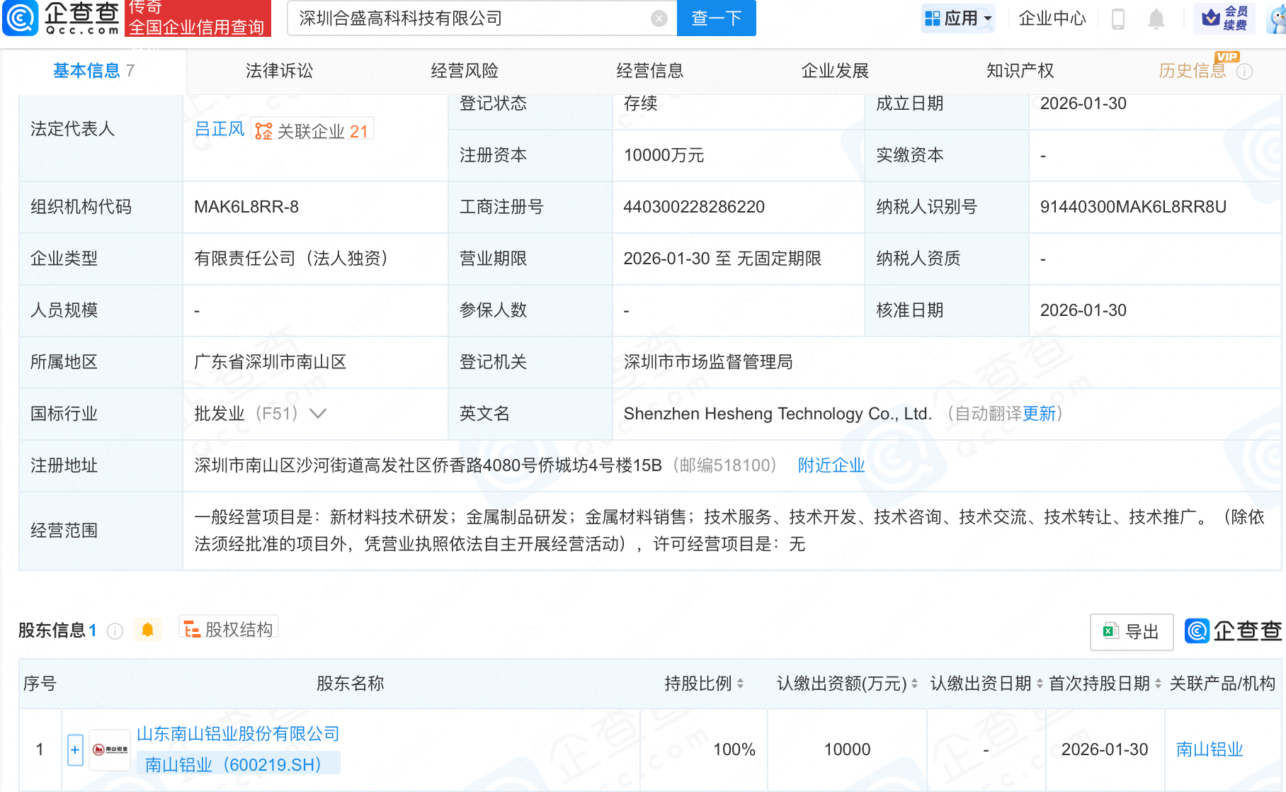 企查查APP显示,近日,深圳合盛高科科技有限公司成立,注册资本1亿元,经营范围包含:新材料技术研发;金属制品研发;金属材料销售等。企查查股权穿透显示,该公司由南山铝业(600219.SH)全资持股。
