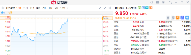 石药集团午后持续走高,截至发稿,涨超7%,报9.85港元,成交额13.24亿港元。