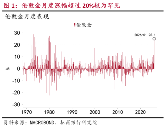 但历史经验显示,黄金单月涨幅超过20%的情况极为罕见,据招商银行统计,自1968年以来,仅出现8次,且全部集中在布雷顿森林体系瓦解、第二次石油危机等特殊历史阶段。1983年之后,如此级别的单月涨幅更是从未出现。