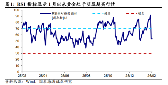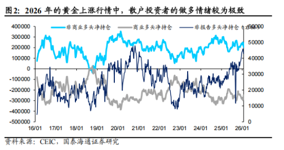 其次,散户杠杆资金成为波动放大器。1月以来,金价的不断飙升使得个人投资者加杠杆的意愿愈发强烈。国泰海通研究显示,黄金非报告多头净持仓在1月已经处于历史高点。在价格出现大幅下跌和交易所连续上调保证金的双重压力叠加下,杠杆资金极易形成“多杀多”的螺旋踩踏,大量资金被动平仓,市场进入加速去杠杆格局。