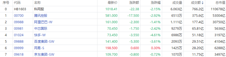 截至收盘,快手-W跌超4%,百度集团-W跌超3%,腾讯控股跌近3%,阿里巴巴-W跌超1%。