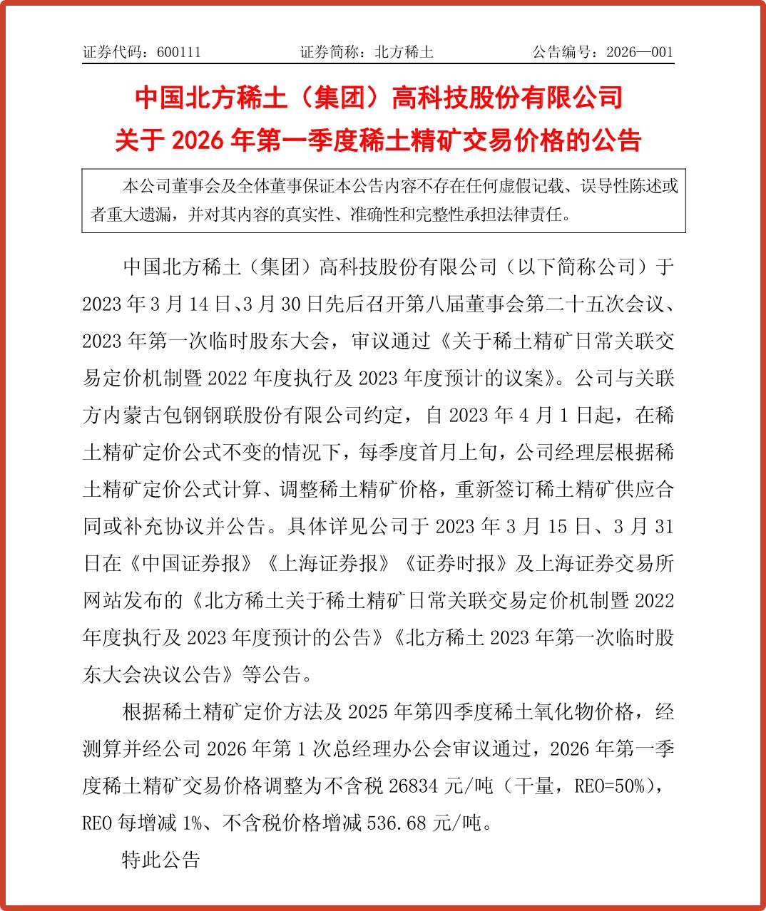 北方稀土与包钢体系的精矿定价机制自2023年4月1日起保持公式不变,季度首月上旬按公式计算、调整并公告。