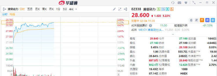 潍柴动力涨超5%,高见28.64港元,再创历史新高。报28.6港元,成交额4.646亿港元。