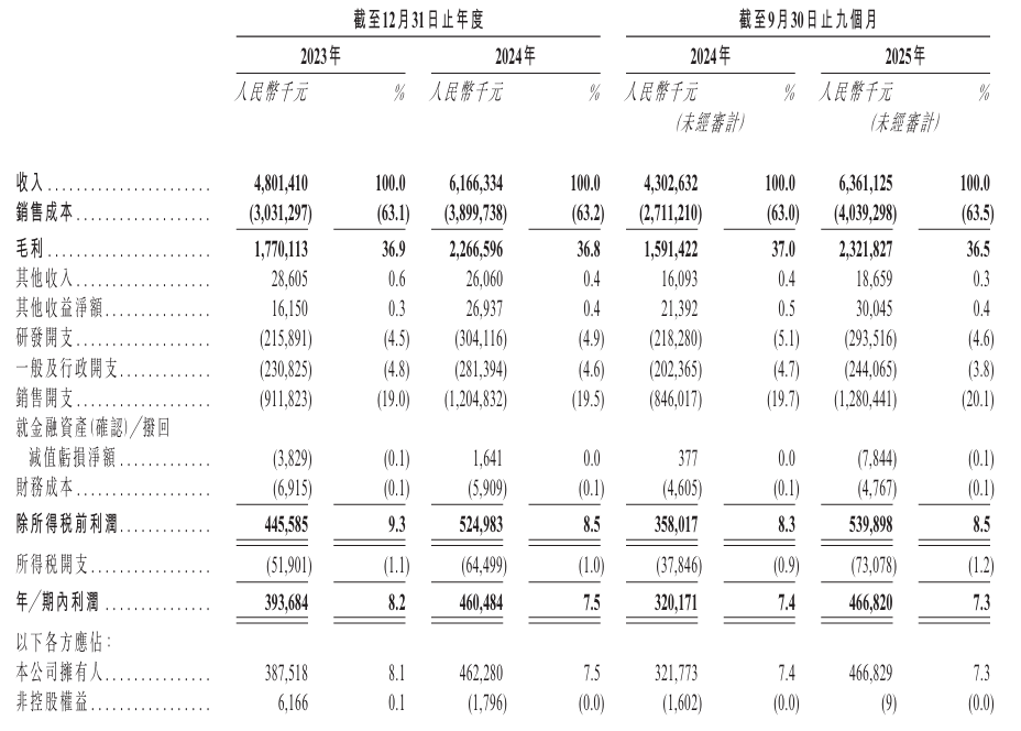 公司于2023年、2024年分别录得收入48.01亿元、61.66亿元,2025年首9月收入同比增长47.84%至63.61亿元。