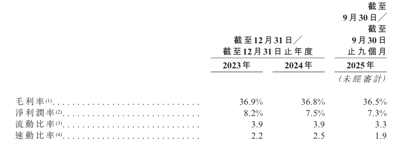 但细究其财务状况发现,公司虽保持着营收和净利润的增长,但盈利效率持续走低,毛利率有逐渐下滑态势,2023年至2025年前三季度的毛利率分别为36.9%、36.8%和36.5%,净利率亦从8.2%降至7.3%。
