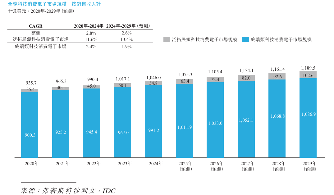 全球科技消费电子市场规模庞大,其整体市场规模从2020年的9,357.0亿美元增长至2024年的10,460.0亿美元,期间年复合增长率达2.8%。其中,终端类科技消费电子产品市场规模从2020年的9,003.0亿美元增至2024年的9,912.0亿美元,期间年复合增长率为2.4%。虽然增速相对温和,但其在整体市场中仍占据主导地位,2024年占比约94.8%。与此同时,作为终端衍生的泛拓展类产品表现突出,其整体市场规模从2020年的354亿美元增长至2024年的548亿美元,2020至2024年间年复合增长率达11.6%。预计到2029年整体规模将达11,895.0亿美元,2024至2029年间年复合增长率约为2.6%。
