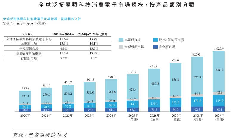 截至2025年12月31日,全球泛拓展类科技消费电子市场前五名企业连接&传输产品全年合计零售额约为69.4亿元。按全年零售额计,公司在全球位列第一。