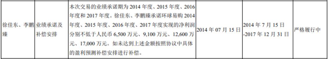 从跨境通2015年的年度报告来看,发生在一年前的收购对徐佳东来说并不是毫无代价的躺赢。年报中披露到徐佳东承诺了被收购之后的2014-2017年,环球易购的净利润要分别达到6500万元、9100万元、1.26亿元以及1.7亿元。