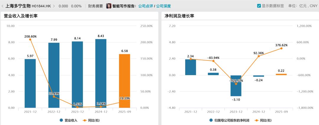 但从业绩上来看,多宁生物似乎并不赚钱。公司营收从2021年的5.97亿元增至2024年的8.4亿元,增速却由208%降至3.54%。