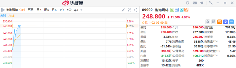 泡泡玛特再涨超4%,年内累计涨幅已超30%。截至发稿,报248.8港元,成交额17.38亿港元。