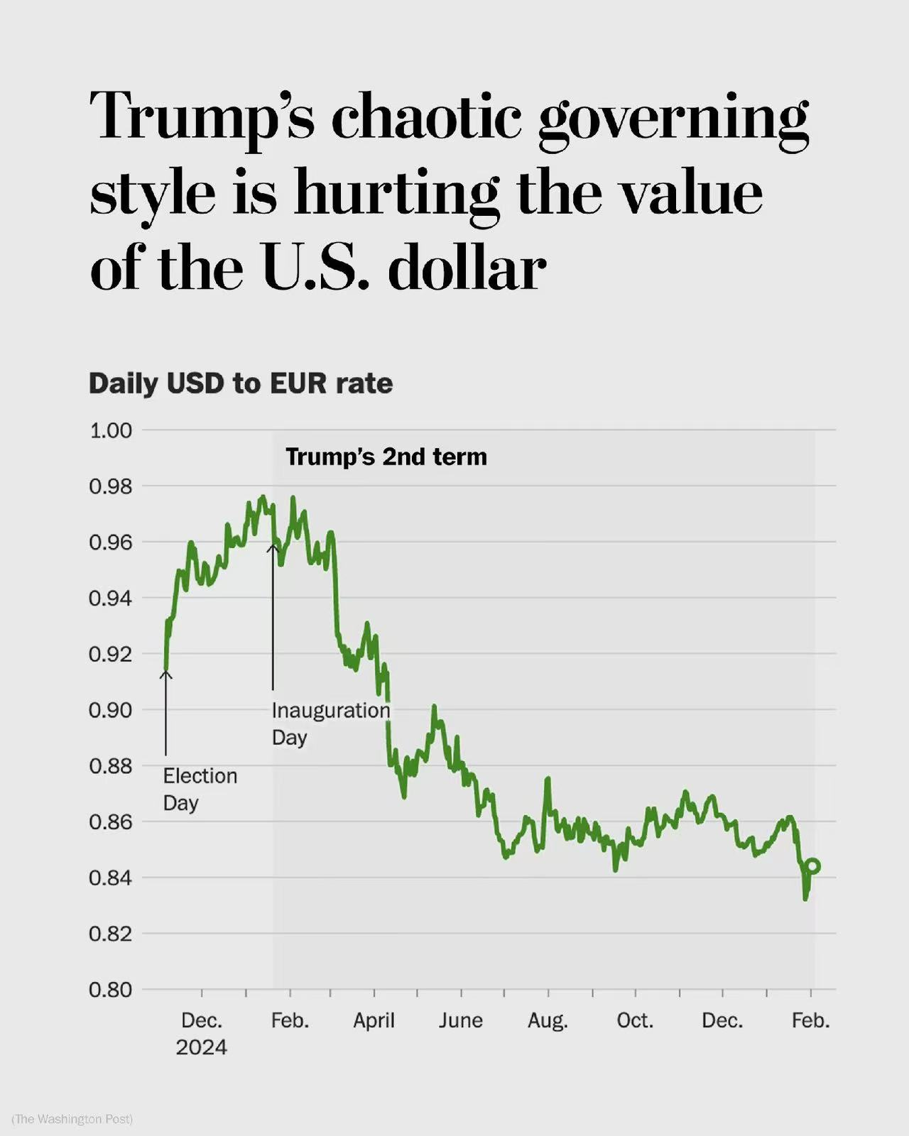 当地时间2月4日,据华盛顿邮报报道,自特朗普总统重返白宫以来,美元价值已下跌超过10%。美元面临多方面压力,尤其是特朗普在关税和军事行动方面反复无常的政策。