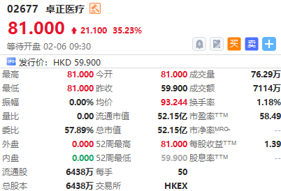 华盛资讯02月06日讯,港股卓正医疗今日挂牌,截至发稿涨35.23%,报81.00港元/股,中签一手账面浮盈1055.0港元,最新总市值超52.15亿港元。该公司获认购2730.73倍,一手中签率1%。