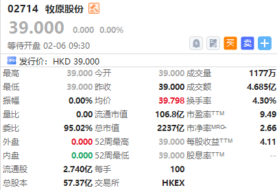 港股牧原股份今日挂牌,截至发稿涨0.00%,报39.00港元/股,中签一手账面浮盈0.0港元,最新总市值超2237.32亿港元。该公司获认购5.88倍,一手中签率100%。