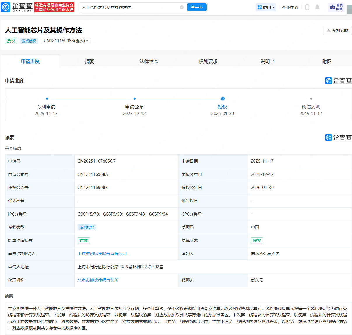 企查查APP显示,近日,壁仞科技(06082.HK)申请的“人工智能芯片及其操作方法”专利获授权。