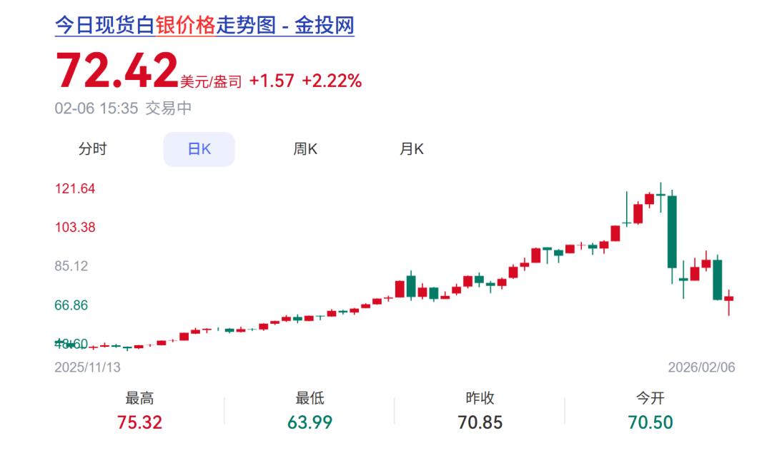 回顾这场暴跌,时间线清晰得令人心痛:2月5日晚间,贵金属尾盘突然加速下跌,现货白银一度暴跌超20%,最低失守71美元/盎司。