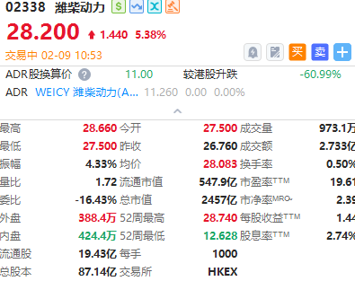 潍柴动力涨超5%,截至发稿,涨5.38%,报28.2港元,成交额2.733亿港元。