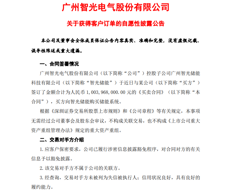 2月9日,智光电气(002169.SZ)发布关于获得客户订单的自愿性披露公告,内容中表示,公司控股子公司广州智光储能科技有限公司于近日与某公司签订了金额合计为人民币10.03968亿元的《买卖合同》,买方向智光储能购买储能系统。
