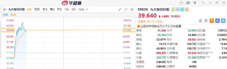 九方智投控股盈喜后一度涨超15%,截至发稿,涨13.32%,报39.64港元,成交额5.038亿港元。