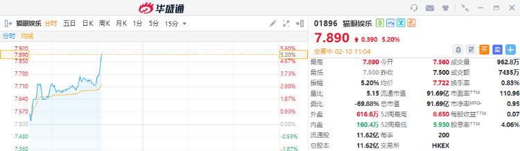 电影概念股盘中持续走高,截至发稿,大麦娱乐涨超7%,猫眼娱乐涨超5%。