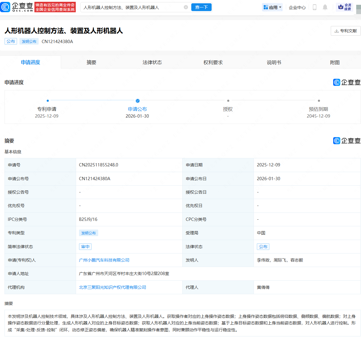 企查查APP显示,近日,广州小鹏汽车科技有限公司申请公布“人形机器人控制方法、装置及人形机器人”专利。