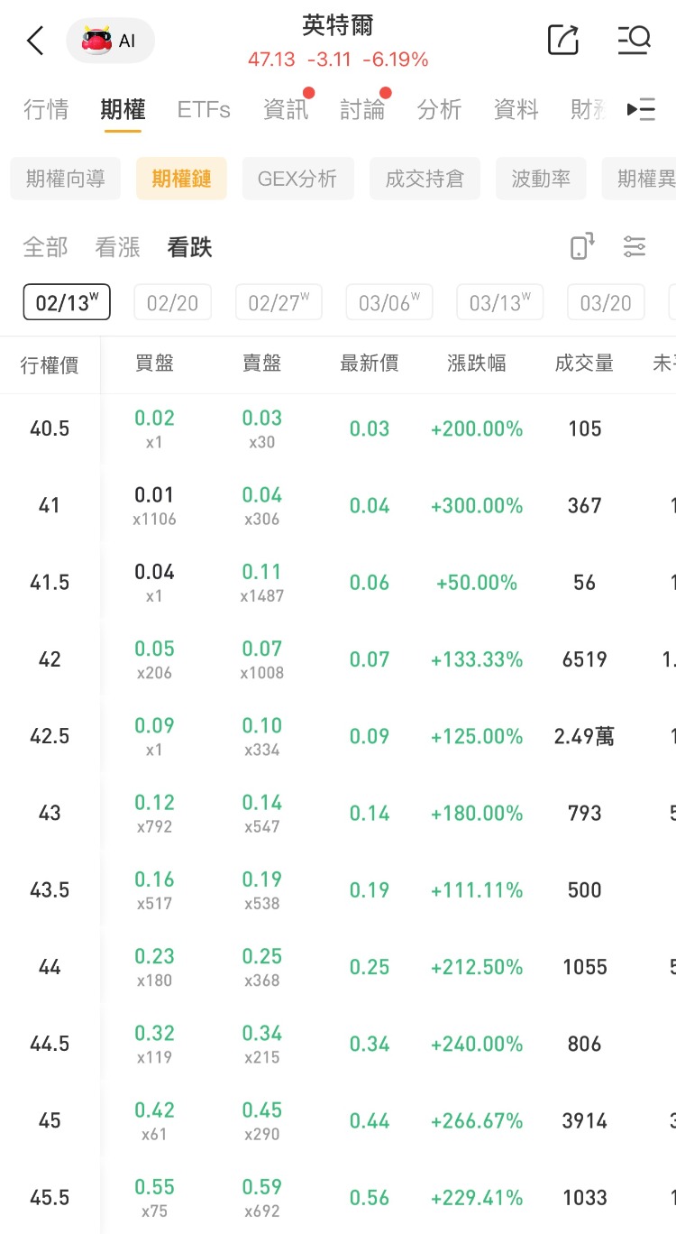 其中一看跌期权(INTC_260213_P_42.50 )交易量达2.49万张,该合约行权价为42.5美元,行权日在2026-02-13,该张期权涨125%。