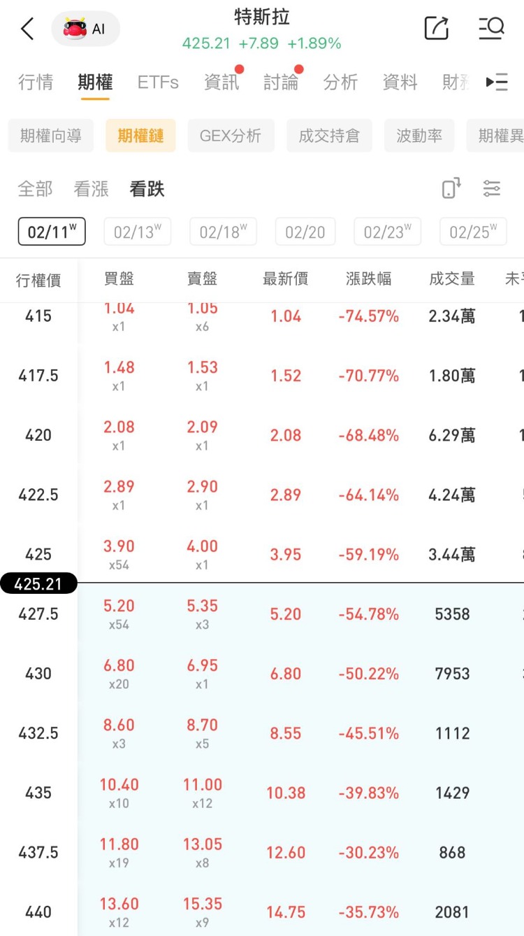 其中一看跌期权(TSLA_260211_P_422.50 )交易量达4.24万张,该合约行权价为422.5美元,行权日在2026-02-11,该张期权跌64.14%。