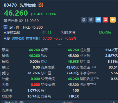华盛资讯02月11日讯,港股先导智能今日挂牌,截至发稿涨1.00%,报46.26港元/股,中签一手账面浮盈46.0港元,最新总市值超774.31亿港元。该股此前公开发售获79.54倍认购,一手中签率18%。