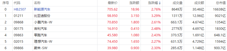 受益于市场多重利好,港股汽车股多数上涨。截至发稿,比亚迪股份涨超3%,小鹏汽车-W、吉利汽车、零跑汽车、理想汽车-W、蔚来-SW均涨超2%。