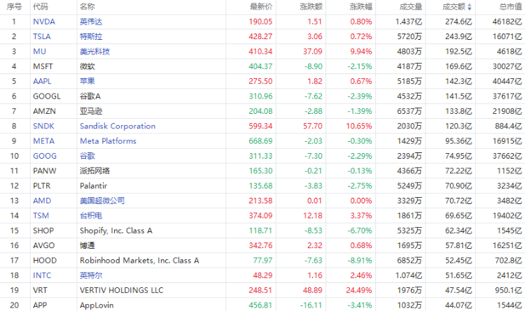 第3名美光收高9.94%,成交190.6亿美元。摩根士丹利周三将该股目标价从350美元上调至450美元,同时维持对这家存储芯片制造商股票的“增持”评级。 这一新目标价高于美光周三收盘价410.34美元的交易价格,并与分析师的普遍看好观点一致。公开数据显示,多位分析师对该股的平均评级为1.56(强烈买入)。