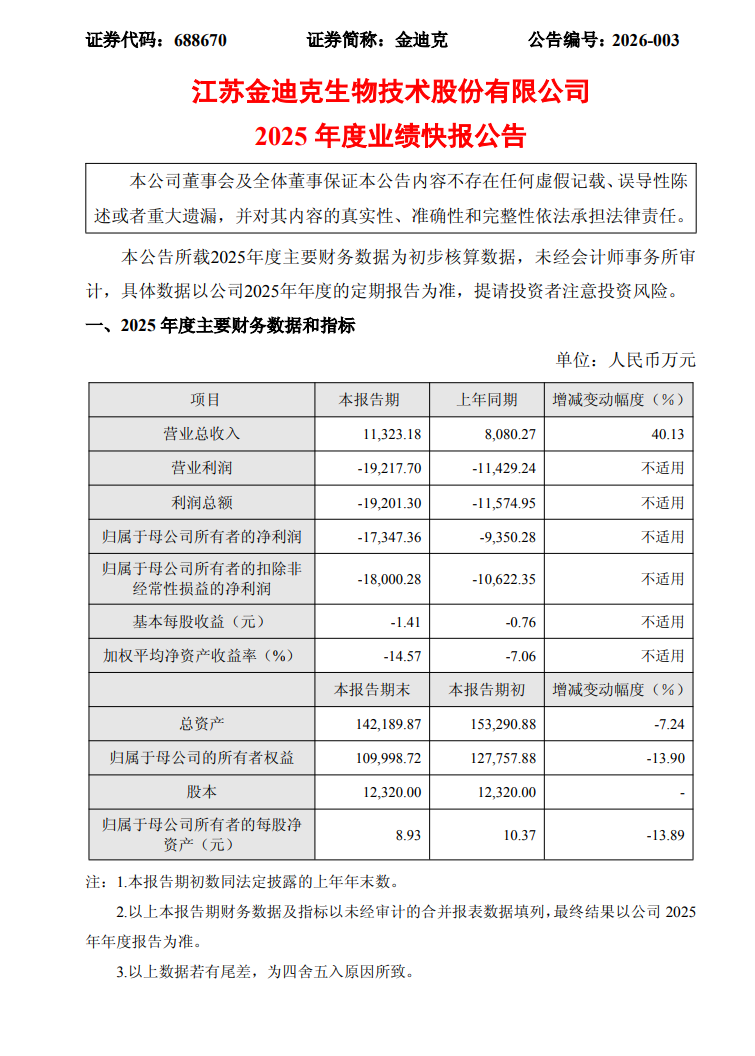 2月12日,金迪克(688670.SH)披露2025年年度业绩快报,全年营业收入1.13亿元,上年同期8080.27万元,同比增长40.13%;利润总额-1.92亿元,上年同期-1.16亿元;归属于上市公司股东的净利润-1.73亿元,上年同期-9350.28万元;归属于上市公司股东的扣除非经常性损益的净利润-1.80亿元,上年同期-1.06亿元;基本每股收益-1.41元,上年同期-0.76元。