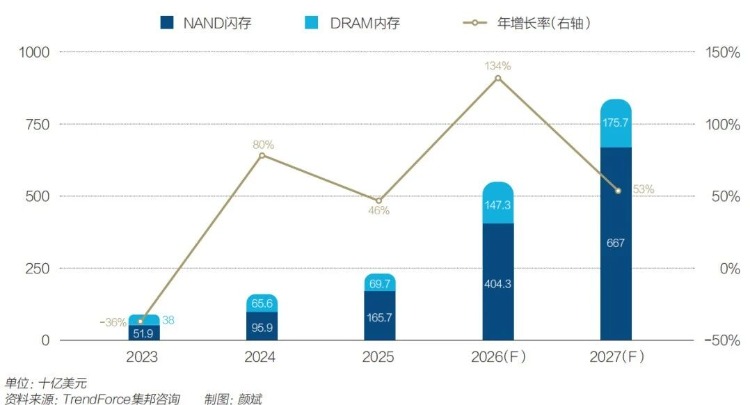 图1:2023年-2027年DRAM内存与NAND闪存产值预估