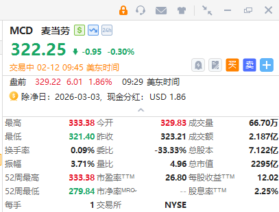 华盛资讯2月12日讯,麦当劳盘初一度涨超3%报333.38美元创新高,Q4美国营收增速创两年新高,现跌近0.5%;