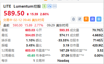 光通信股集体上扬,Lumentum控股股价一度突破600美元关口创历史新高,现涨近3%;安费诺、Astera Labs涨超3%,Ciena涨超2%,康宁涨超1%再创新高。